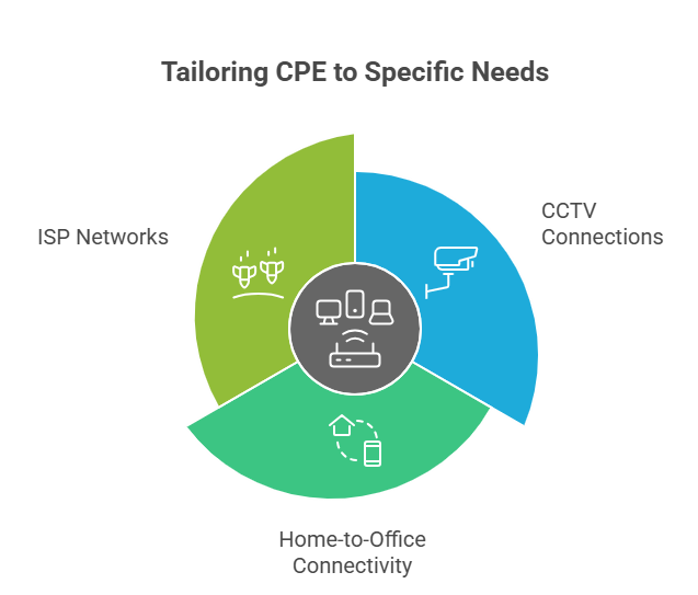 Short-range use cases like connecting a CCTV camera at a nearby building may work with basic CPEs. Medium-range distances require stronger antennas, while ISPs handling long-range network distribution need advanced devices with higher power.